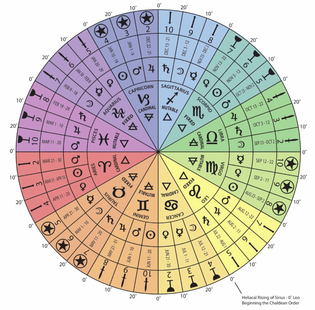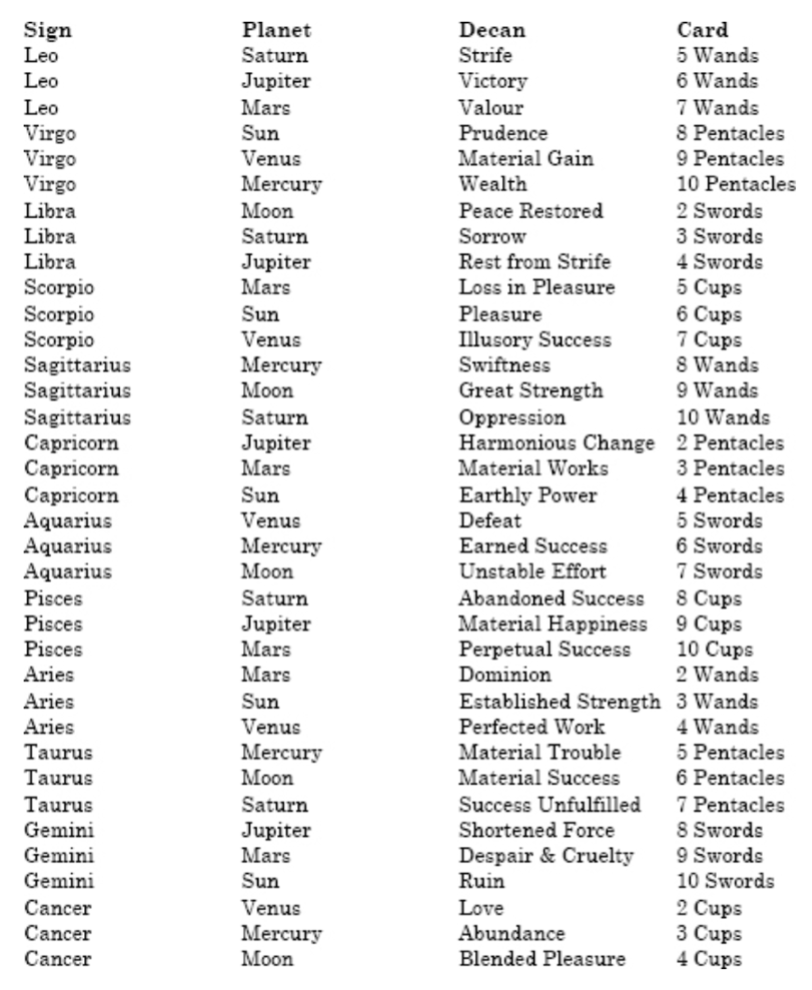 In Book T, Mathers also connected the numeral cards, excluding the Aces, to the 36 decans found in Egyptian astrology, with each card numbered 2 through 10 covering one-third of a zodiac sign and governed by a particular planet.