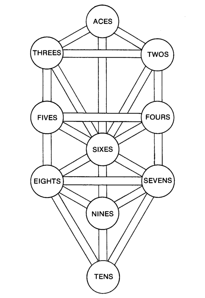 Mathers’ theory features intricate associations with the numeral Minor Arcana. He linked each rank to a sephira on the Tree of Life. The Aces correspond to Sephira 1, Kether, progressing through to the 10s, which align with Sephira 10, Malkuth.