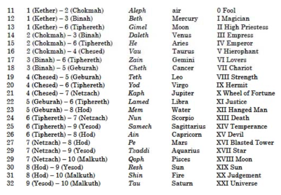 The tarot essay within the Cypher Manuscript, widely known as “the Tarot lecture” in the Golden Dawn tradition, aligns the ten numerical cards of each suit with the ten Sephiroth, equates the four suits to the four Kabbalistic worlds, and associates the sixteen court cards with the Tetragrammaton. The remainder of the lecture focuses on the Tarot trumps and their correlations to the pathways on the Tree of Life, as well as their associations with the 22 Hebrew letters. While Éliphas Lévi incorporated the Kabbalah into his system of magic, integrating it with the Tarot by linking the 22 major arcana to the letters of the Hebrew alphabet, the Cypher Manuscript, which the Golden Dawn adhered to closely, went further through its reference of the ten sephiroth and in highlighting the significance of the Tree of Life. The manuscript emphasizes that the sephiroth are ten in total, numbering them from 1 to 10 in accordance with the established conventions of Kircher and thereby not recognizing Daath as a conventional sephira. The pathways—referred to simply as “paths”—which connect together the ten Sephiroth are numbered from 11 to 32, diverging from Kircher’s method, which enumerates them from 1 to 22. Nevertheless, this numerical arrangement is consistent with the way in which Kircher orders the pathways and his Hebrew letter designations. The Golden Dawn regarded Kircher’s version of the Tree, with its allocation of letters to the pathways, as canonical. The associations of the Tarot major arcana acknowledged by the Golden Dawn were as follows: