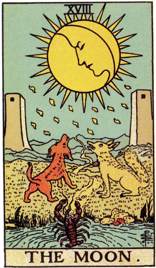 Pamela Colman Smith’s illustration is a clear homage to the Marseille tradition, featuring a moon overlooking a dog, a wolf, and a crayfish in a pool. The full moon shines brightly, reflecting the light of the sun into the darkness of the night. The moon has a face, which is in profile, indicating that the Moon is a conscious being. Around the Moon, there are thirty-two rays that allude to the thirty-two paths of wisdom. The pool of water represents the great deep of the cosmic mind, from which all organic life comes forth. The path that is rising out of the edge of the pool is bordered with stones and plants. These are symbols of the mineral and vegetable kingdoms. As it progresses to where the dog and the wolf are, this represents the animal kingdom. The path continues between two watchtowers, which mark the boundaries between what is known and what is unknown, the unknown signifying the mountains beyond the watchtowers. Between the towers, there are flames of moonlight that also rain down on the Earth below. These fifteen yods hang in the air, signifying the fifteenth day of the twenty-eight-day lunar cycle that brings the light of the full moon. The Moon and the path that continues to the beyond, rising and falling through blue distances, represent the plains of consciousness that are open to us, especially during sleep or trance states.