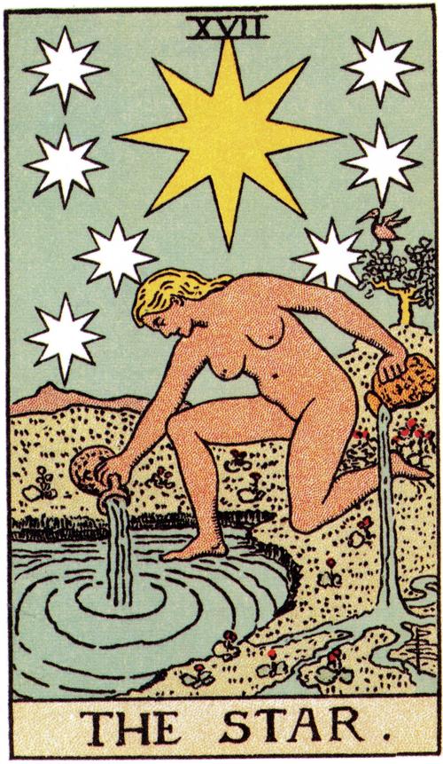 Naked Woman Kneeling by the Pool: The woman represents Venus (Netzach) and her pool symbolizes the Moon (Yesod). This is in reference to the Star’s path.